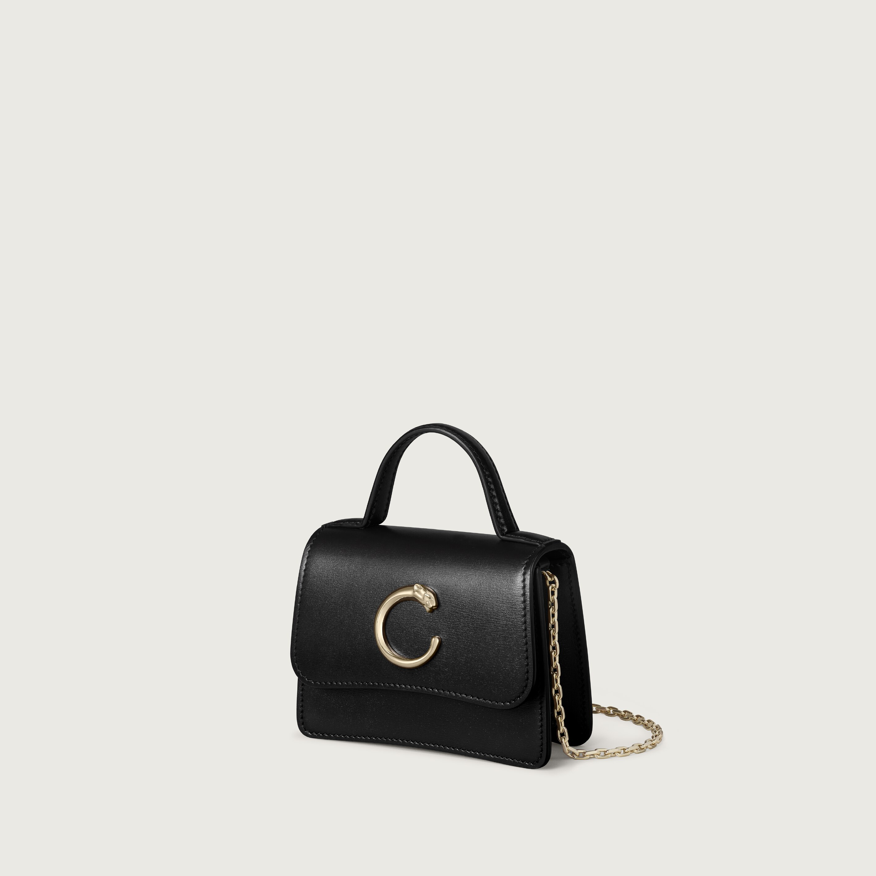 Panthère C de Cartier micro model chain bag in cherry red calfskin, golden-finish signature Panthère logo. Interior: black lambskin, golden hot-stamped “Cartier” signature. Removable chain. Dimensions: height 90 mm x length 115 mm x depth 40 mm. Cross-body, shoulder or belt carry (with additional hook).