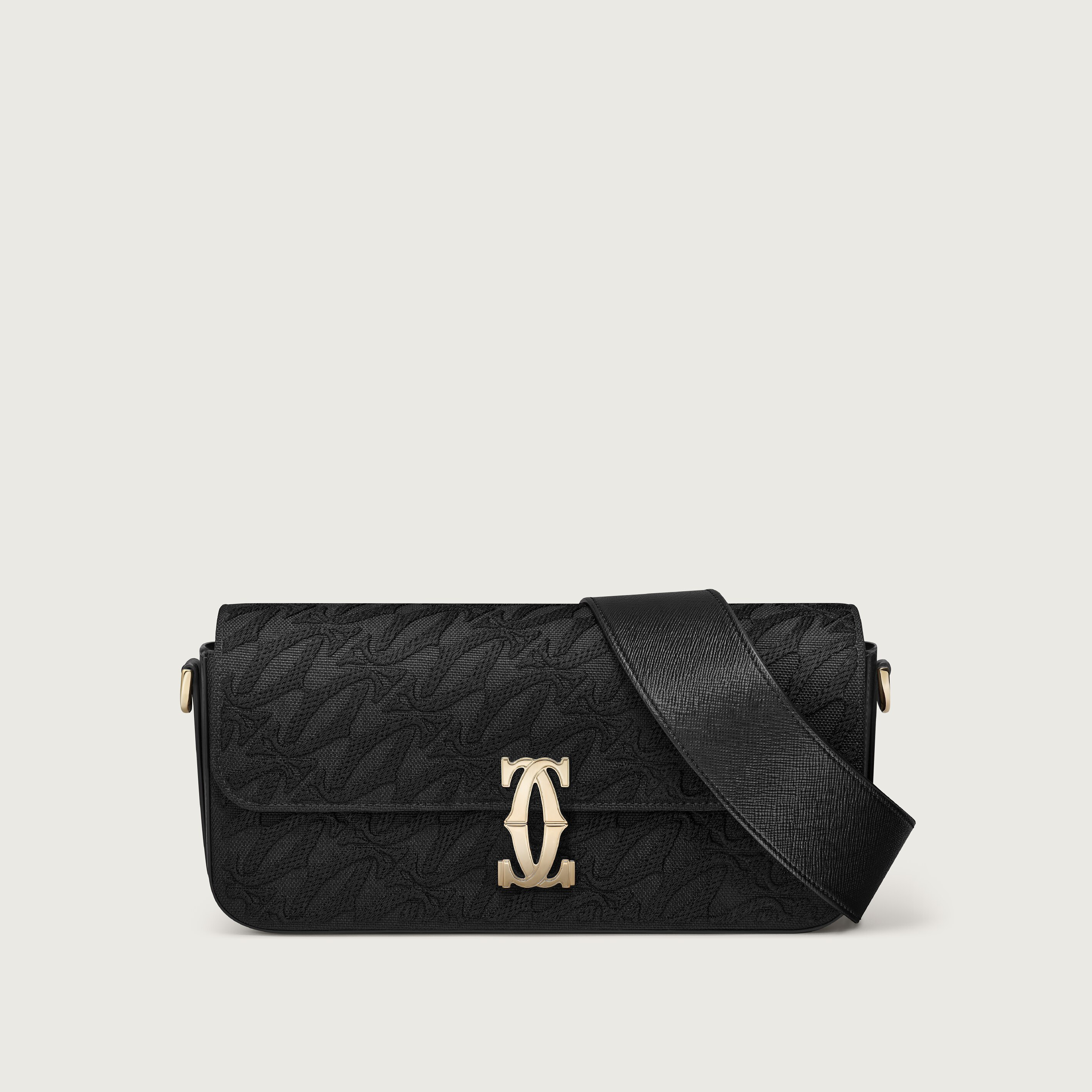 A stylized clasp adds a touch of sparkle to a leather bag. Embossed with the Cartier logo and embroidered with sequins, it is simultaneously understated and bold.