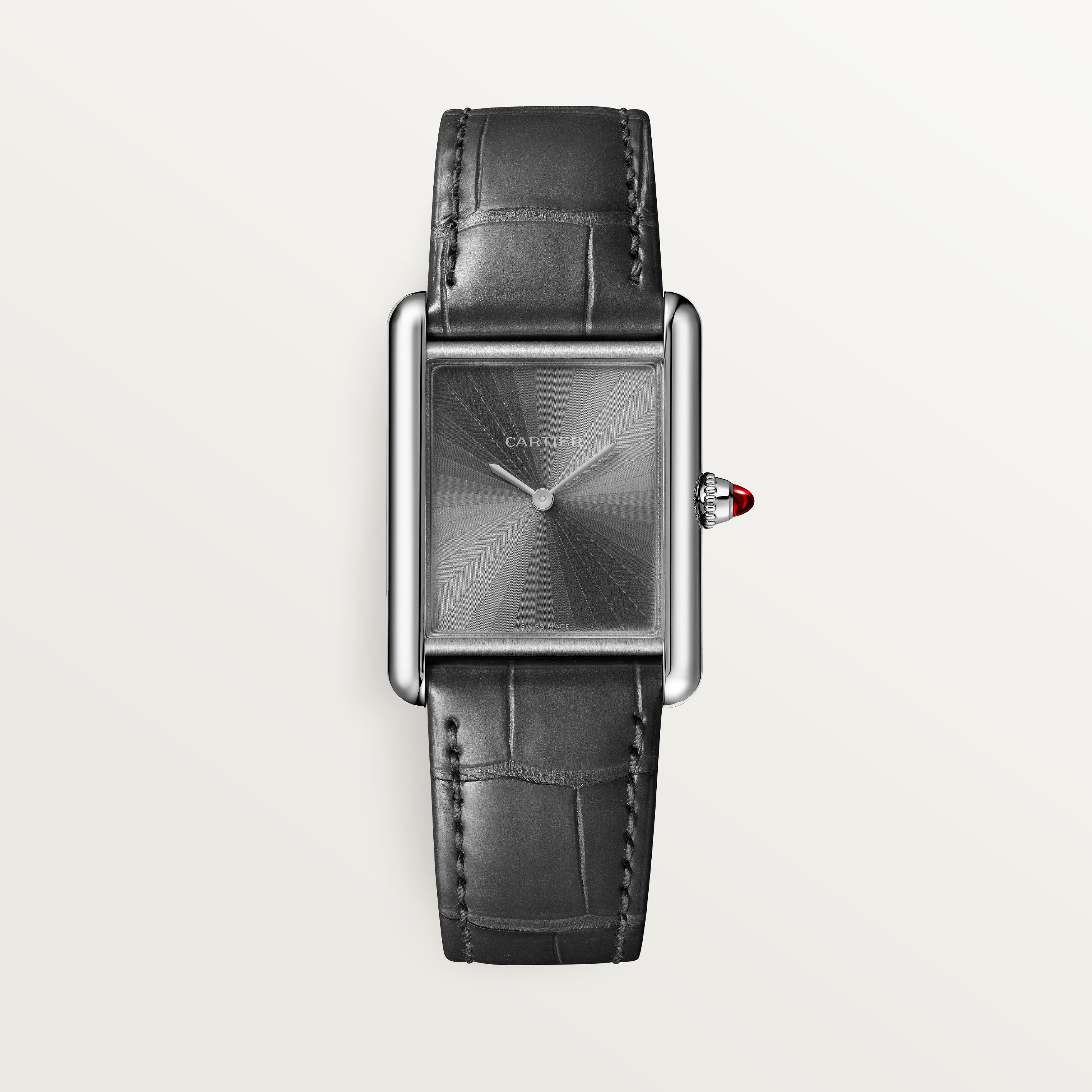 The Tank watch is defined by its two parallel brancards, along with its Roman numerals and the winding crown adorned with a cabochon sapphire.